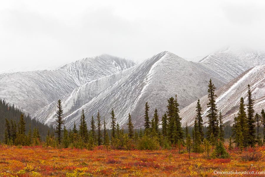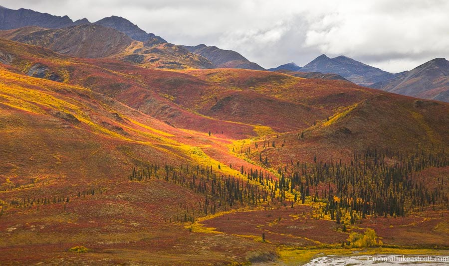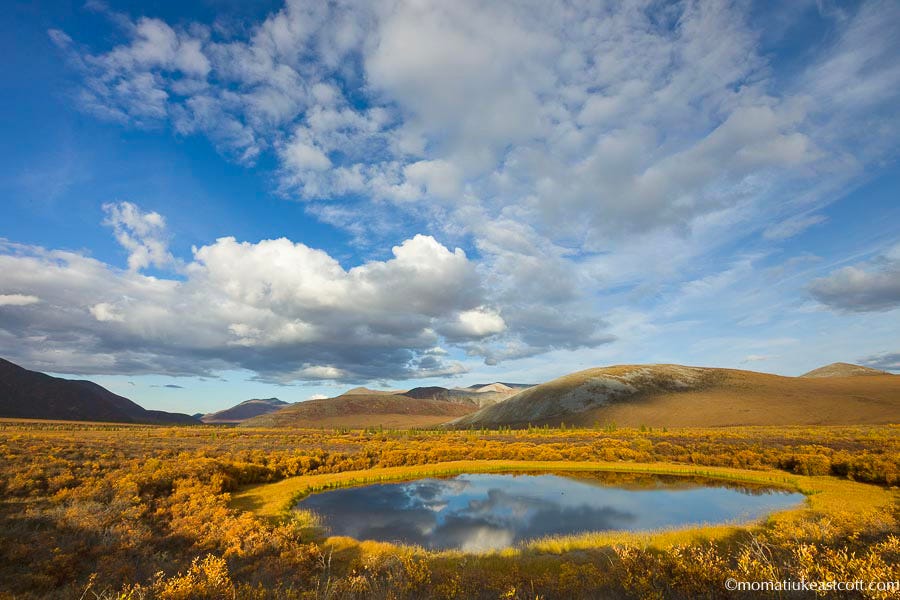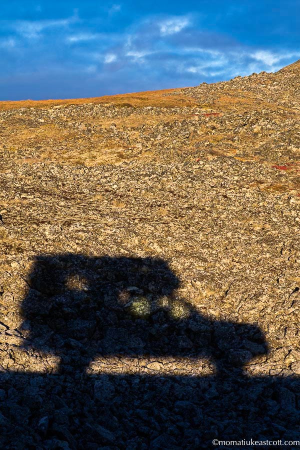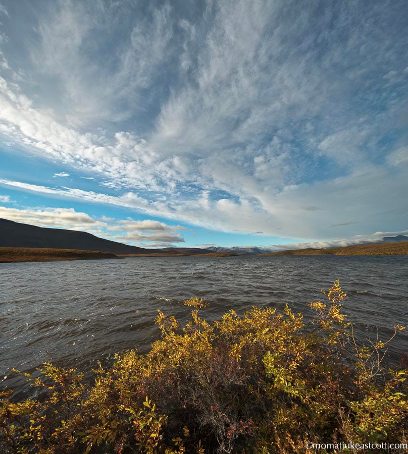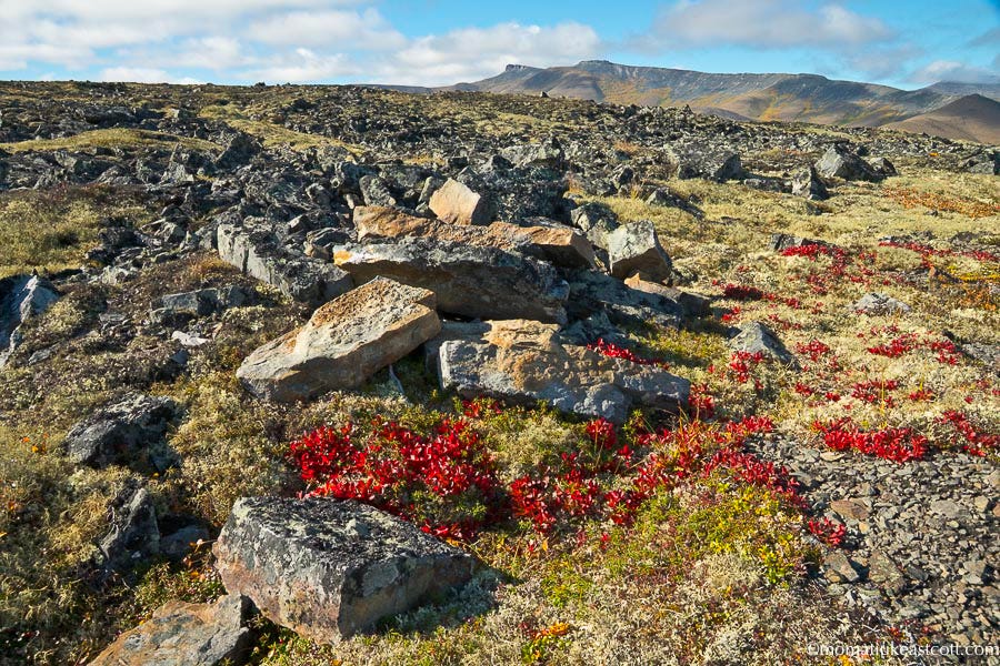 Soon the tundra starts to roll and buckle, with crimson patches of blueberry bushes riding its rocky waves.