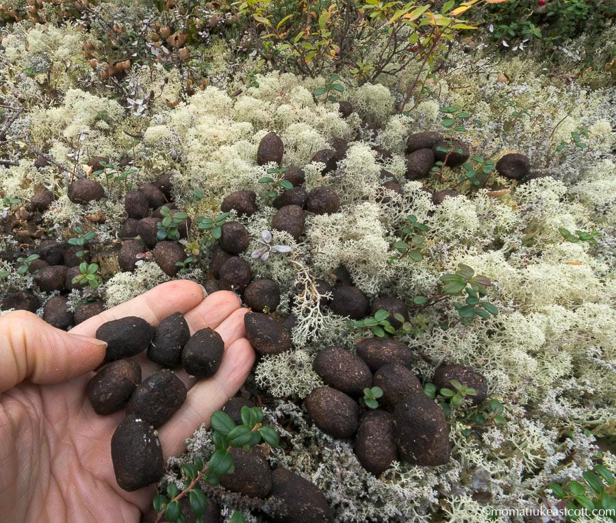 We both collect spider webs on our foreheads and blueberry elbows. There are many animal droppings: this bunch of pellets signals caribou presence.