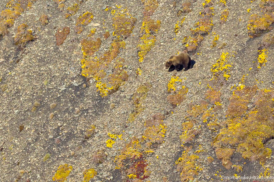 In the morning we look around and, sure enough, there is our house rocker crossing a steep slope on a diagonal line which may, or may not be, his trail. In the next few weeks he has to pack on far more weight to survive winter hibernation which may last seven months. Here in the Arctic all nature's rules are spelled all too clearly, and to lose quarter of your body fat -- but still survive the winter -- you need to fatten up. Females' gain and loss of weight is even more extreme. So our house rocker, driven by hyperphagia -- extreme appetite -- has to hunt large game, devour carrion, pursue Arctic ground squirrels, chew supple roots of alpine hedysarum and vacuum ripe blueberries all day. He has no interest in us.