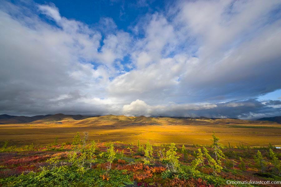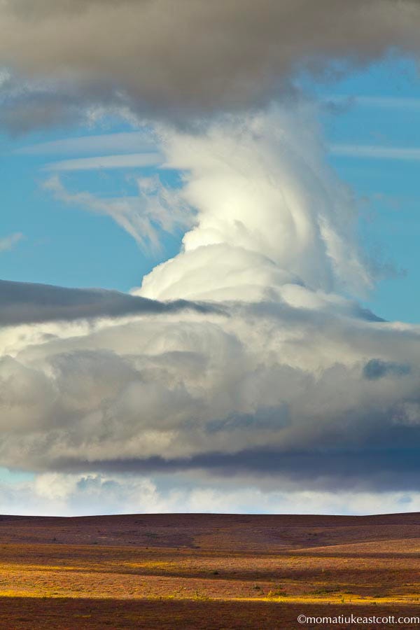 After the next few sun-suffused cold days we emerge from the Richardson Mountains and the land flattens. The clouds are here, too. Towering.