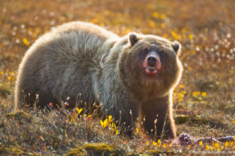 And yes, the caribou hunting season has been here full tilt. The bears learn about it faster than we do, and now they do not even interrupt their offal slurping and bone crushing labors. One boar faces us with the message written all over his wide face: what the hell are you doing here? This is not your kill!