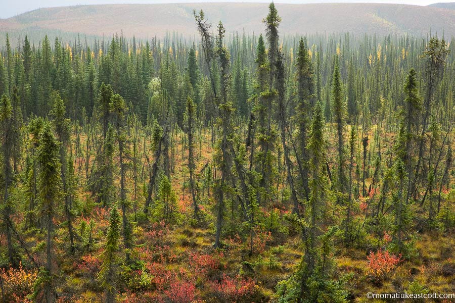 This is where taiga, the spiky northern forest of mostly black spruce we call pipe cleaners, as well as fir and larch, slowly recedes and is about to slide into tundra.